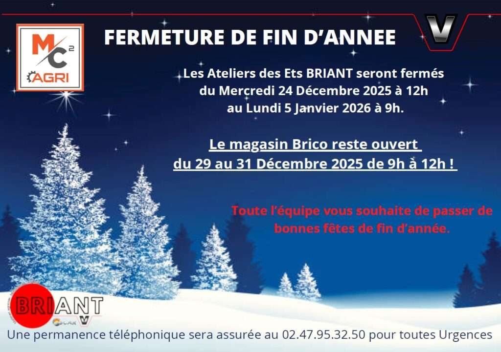 Les ATELIERS des Ets BRIANT seront fermés du Mercredi 24 Décembre 2025 à 12h au Lundi 5 Janvier 2026 à 9h.